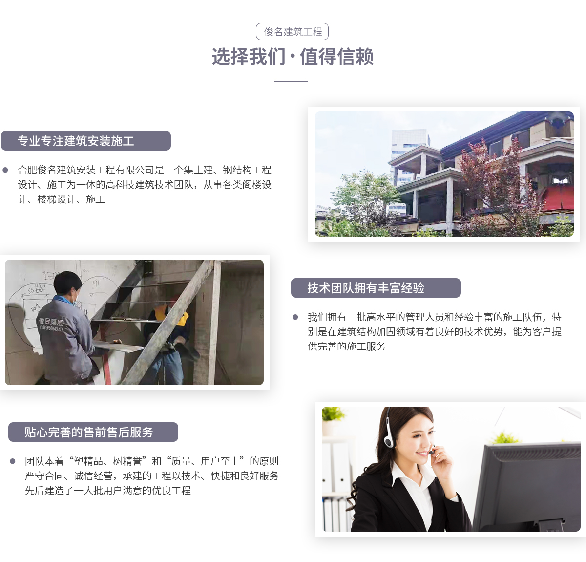 - 合肥俊名建筑安裝工程有限公司是一個集土建、鋼結構工程設計、施工為一體的高科技建筑技術團隊,從事各類閣樓設計、施工。我們擁有一批高水平的管理人員和經(jīng)驗豐富的施工隊伍,特別是在建筑結構加固領域有著良好的技術優(yōu)勢。團隊員工精誠團結,以“尊重規(guī)范,拒絕平凡”為宗旨,為客戶提供完善的施工服務。團隊本著“塑精品、樹精譽”和“質量、用戶至上”的原則,嚴守合同、誠信經(jīng)營,所...